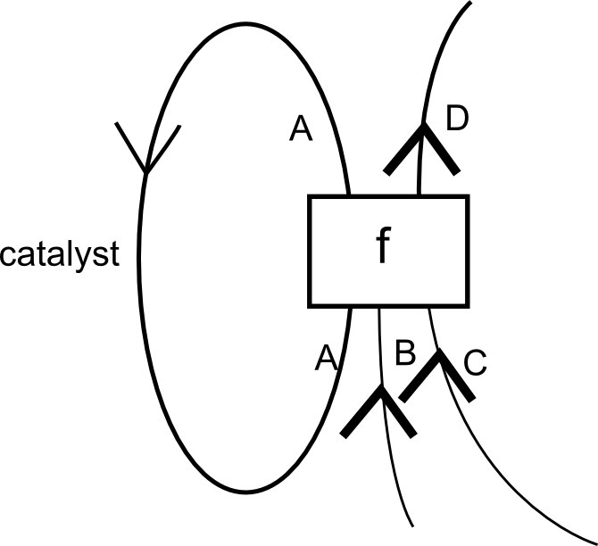I then realized by looking at the diagram that what I had invented was the catalyst, in an abstract sense. This means that catalysts, when seen in networks of chemical processes are actually traces in the category. This also kind of indicates that chemical process networks should be modeled as these kinds of diagrams. But then this only makes sense since chemical reactions are exactly maps in the category of Hilbert spaces and the axioms of this category are equivalent to the rewrite axioms of these diagrams.